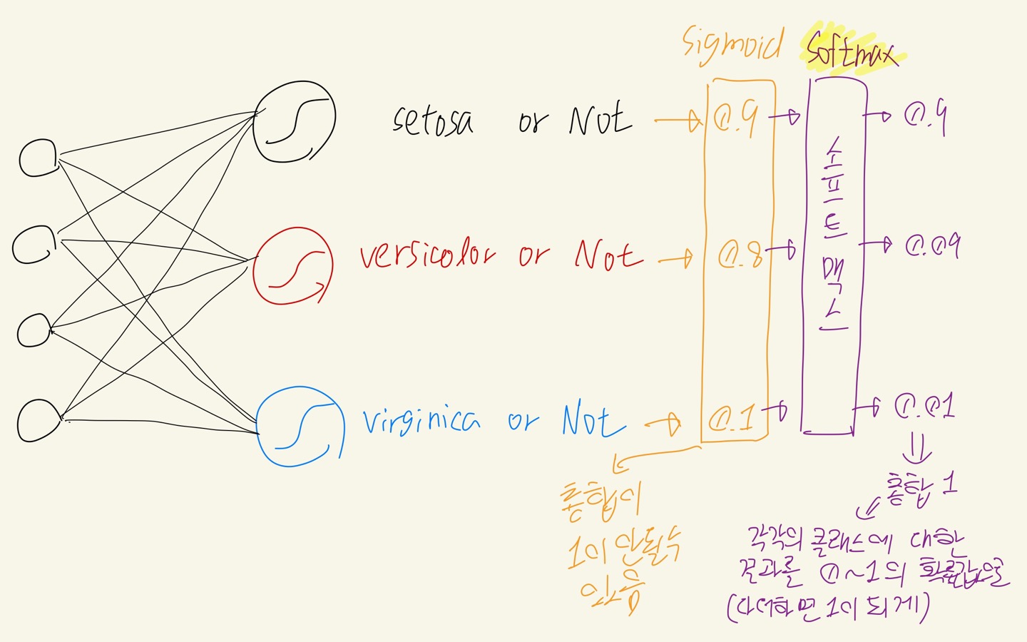 따라서 setosa, versicolor, virginica 각 클래스에 대한 결과를 각각 얻어내야 한다.