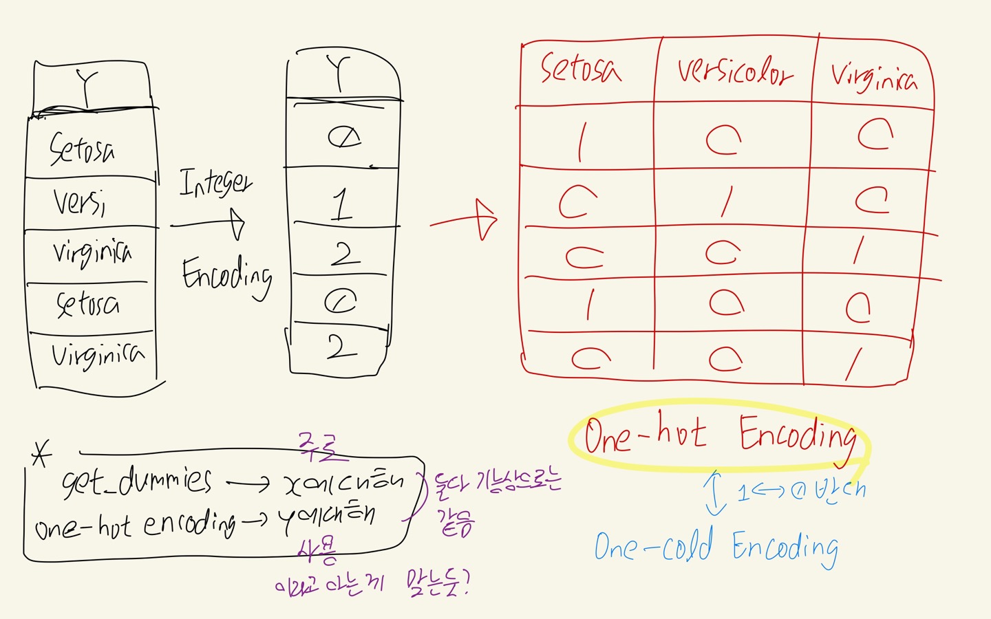 이를 위해 하나의 feature로 3개의 값을 갖는 것이 아니라, 각각의 클래스feature에 대해 0과1의 두가지 값만 갖도록 데이터의 구조를 바꿔주는 One-hot Encoding을 수행해준다.