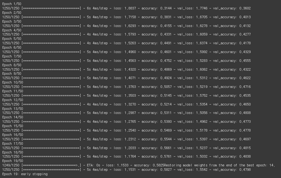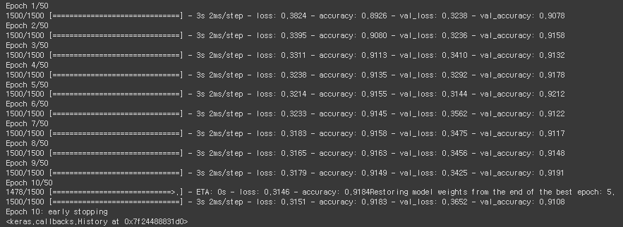 - restore_best_weights : 학습이 멈췄을 때 최적의 가중치 사용
