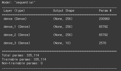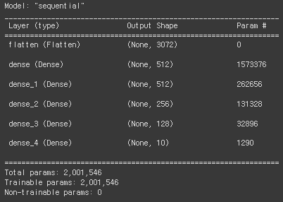 model.summary()로 모델링 정보를 확인해보면 인풋 레이어 다음에 flatten 레이어가 위치해있고, Param 개수가 0인걸 보면 아무 학습도 이루어지지 않는 계층이라는 것을 알 수 있다. Flatten()은 그냥 이전 계층의 차원만 바꿔주는 계층이라고 보면 된다.