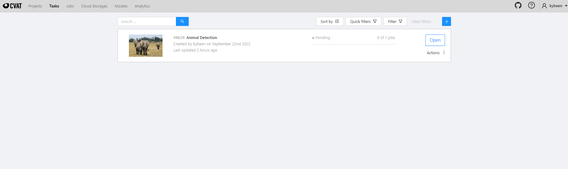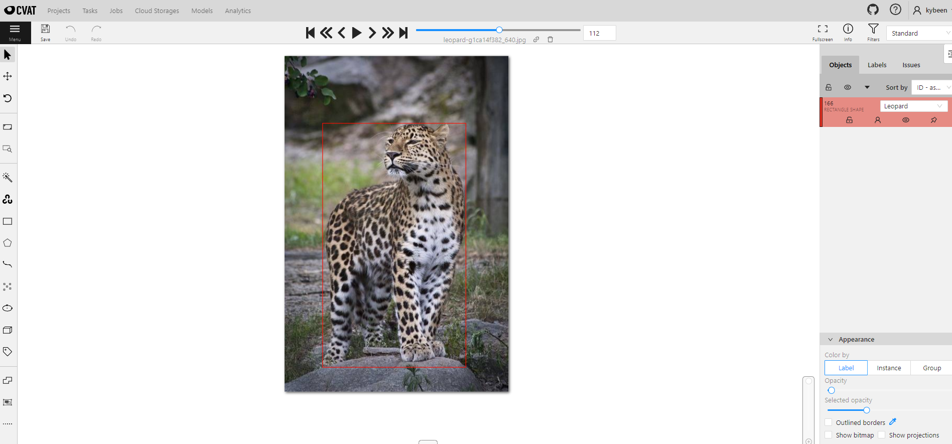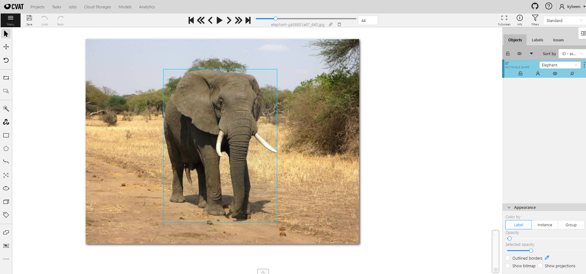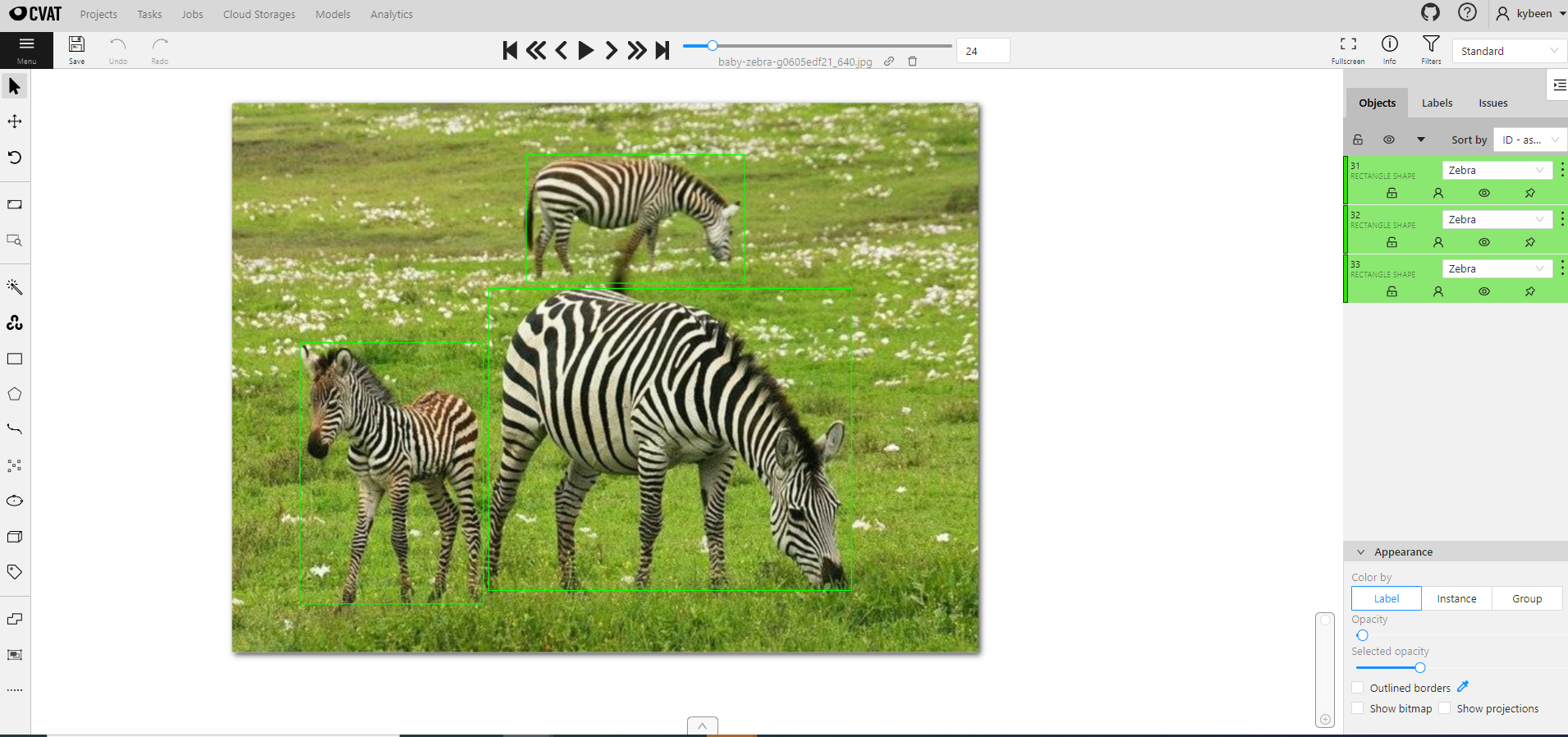 아래와 같이 CVAT 상에서 직접 수집한 얼룩말, 코끼리, 기린, 표범의 사진들에 Boxing(Labeling)을 진행해주었다.