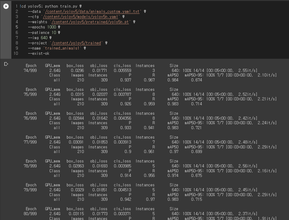 --data '/content/yolov5/data/animals_custom.yaml.txt' \ # 커스텀 데이터를 인식하기 위한 .yaml파일