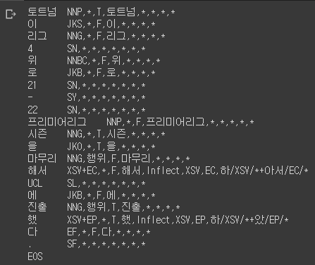 print (tagger.parse(sentence)) # 각 형태소와 해당하는 품사태그가 나온다.