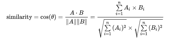 위의 식으로 유사도를 계산하는 방법으로 두 벡터간 각도의 코사인값을 이용하여 측정된 벡터간의 유사한 정도를 의미한다.