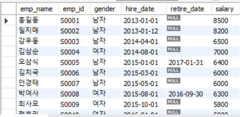 - 은퇴하지 않은(근무중인) 직원 중에서 : WHERE