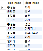 아래 결과와 같이 employee의 emp_name과 department의 dept_name의 가능한 모든 조합을 보여준다.