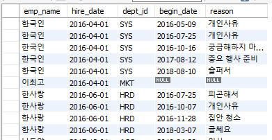모든 직원에 대한 휴가 현황을 조회한 것이기 때문에 휴가를 가지 않은 직원에 대해서도 조회가 된다. INNER JOIN을 했었다면 휴가를 갔던 직원들만 나올 것이다.