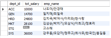-- 그룹 별 salary의 총합을 보여주면서, 누가 있는지 확인