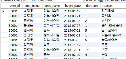 INSERT INTO vacation(emp_id, begin_date, end_date, reason) VALUES('S0001', '2013-01-12', '2013-01-12', '감기몸살');