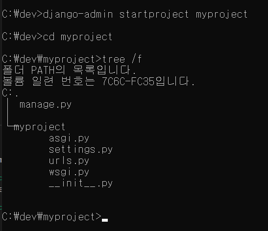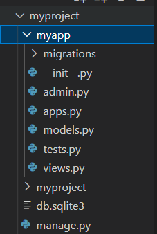 명령어를 실행하고 나면 프로젝트 폴더 내에 myapp이라는 폴더가 생긴다.