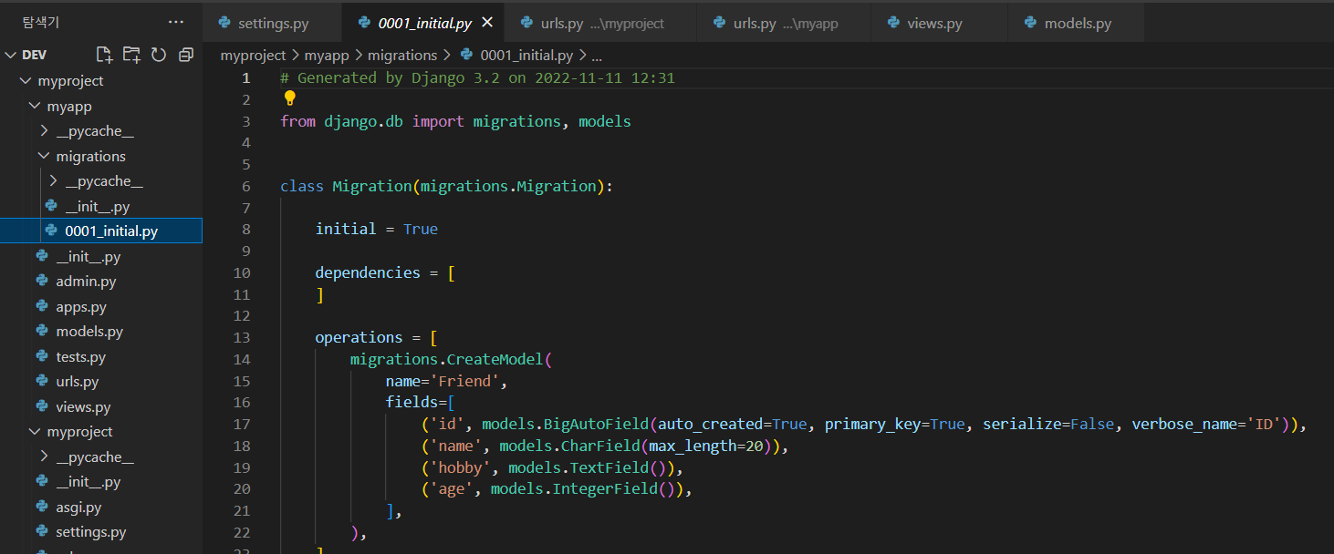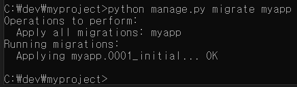 Migration 파일을 생성해주면 myapp/migrations폴더에 파일이 새로 생긴다.(0001_initial.py)