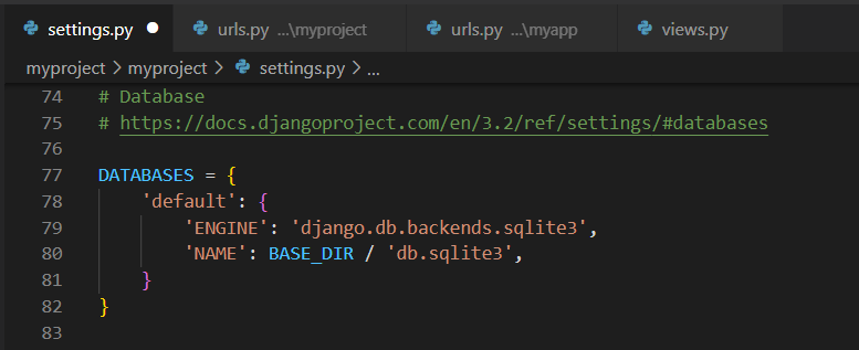 myproject/settings.py 파일에서 DB 환경설정이 가능하다.