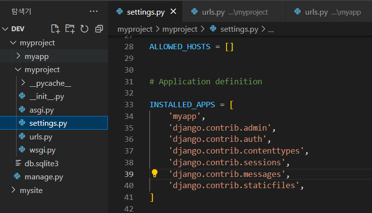 myproject/settings.py 파일의 INSTALLED_APPS 변수를 확인해보면 현재 장고 프로젝트에서 서비스 하고 있는 app들을 볼 수 있다.