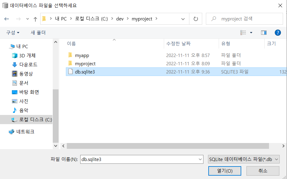 DB Brower for SQLite를 사용해서 sqlite3 db파일을 확인해보자. 프로젝트 폴더 안에 sqlite3 파일이 있는 것을 볼 수 있다.