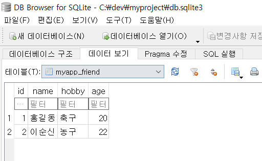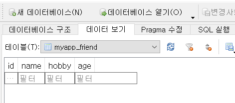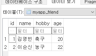 DB 테이블을 확인해보면 myapp_friend라는 테이블을 볼 수 있다. Model 객체를 이용해서 테이블을 생성할 때 기본적으로 소문자로 'app이름_Model객체이름' 형식의 이름을 갖는 테이블이 만들어진다.