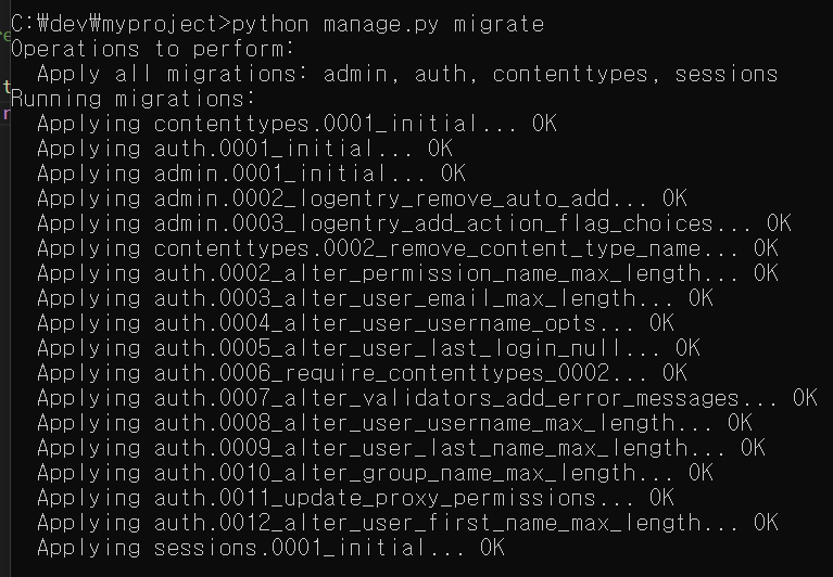 프로젝트를 생성하고 나서 장고 프로젝트에서 기본적으로 제공하는 Model을 내 DB에 반영하기 위해 migrate를 한 번 해준다. admin, auth, ..등 장고의 기본 app들에 대한 migrate가 수행되는 것을 볼 수 있다.