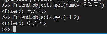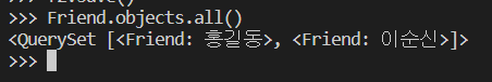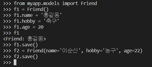f1이라는 변수명에 Friend() 객체의 인스턴스를 생성해주었고, 각 필드의 값을 넣어주었다. f1 인스턴스는 하나의 레코드(행)을 의미한다. 인스턴스에 레코드를 만들어주고 나면 반드시 .save()를 해주어야 DB에 반영이 된다.
