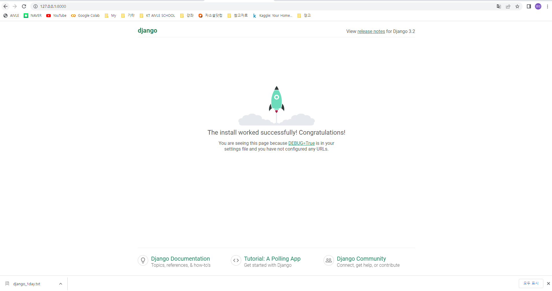 실행 시 나오는 로컬호스트 주소로 접속해보면 장고 웹서버가 실행된 것을 확인해볼 수 있다.