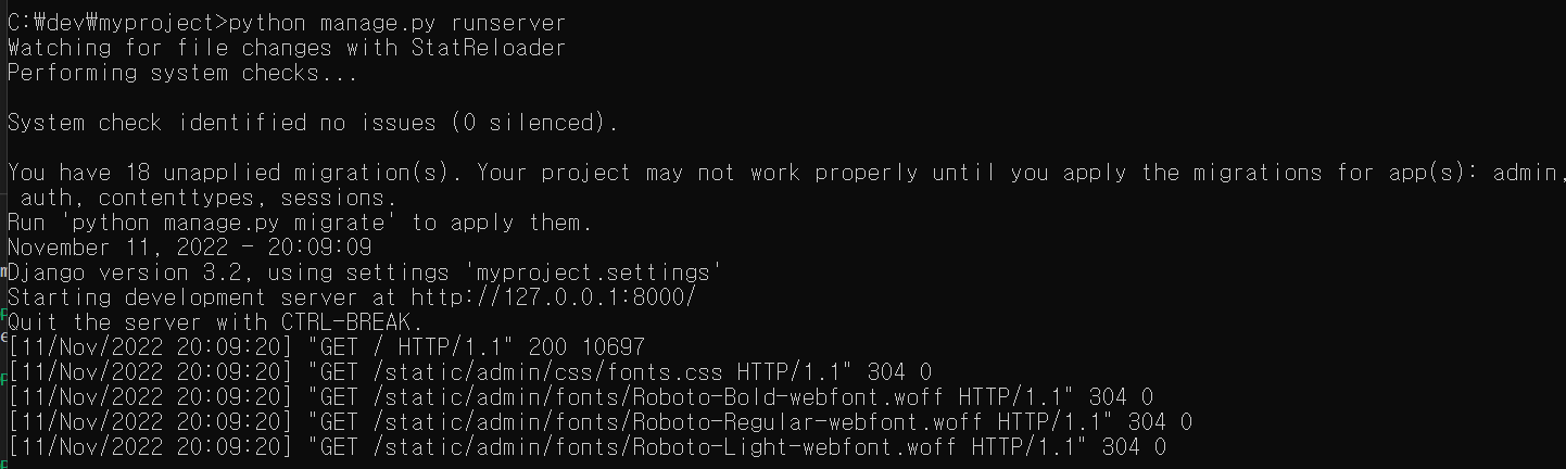 manage.py 유틸리티를 사용해서 한번 장고의 웹서버를 실행시켜 보자 (장고에서 기본적으로 제공하는 웹서버가 있다.)