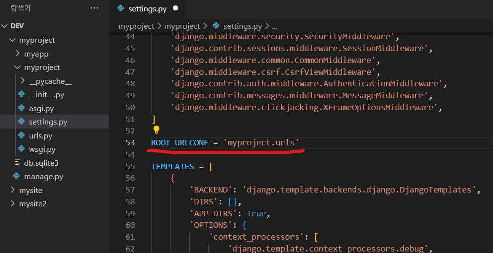 ROOT_URLCONF = 'myproject.urls' 는 myproject/urls.py 파일로 접근한다는 것을 의미한다.