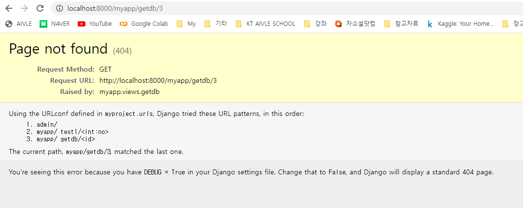먼저 myapp/getdb/<id> 요청 시 views.py모듈의 getdb 메서드로 가도록 URL 맵핑을 해주었다.
