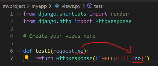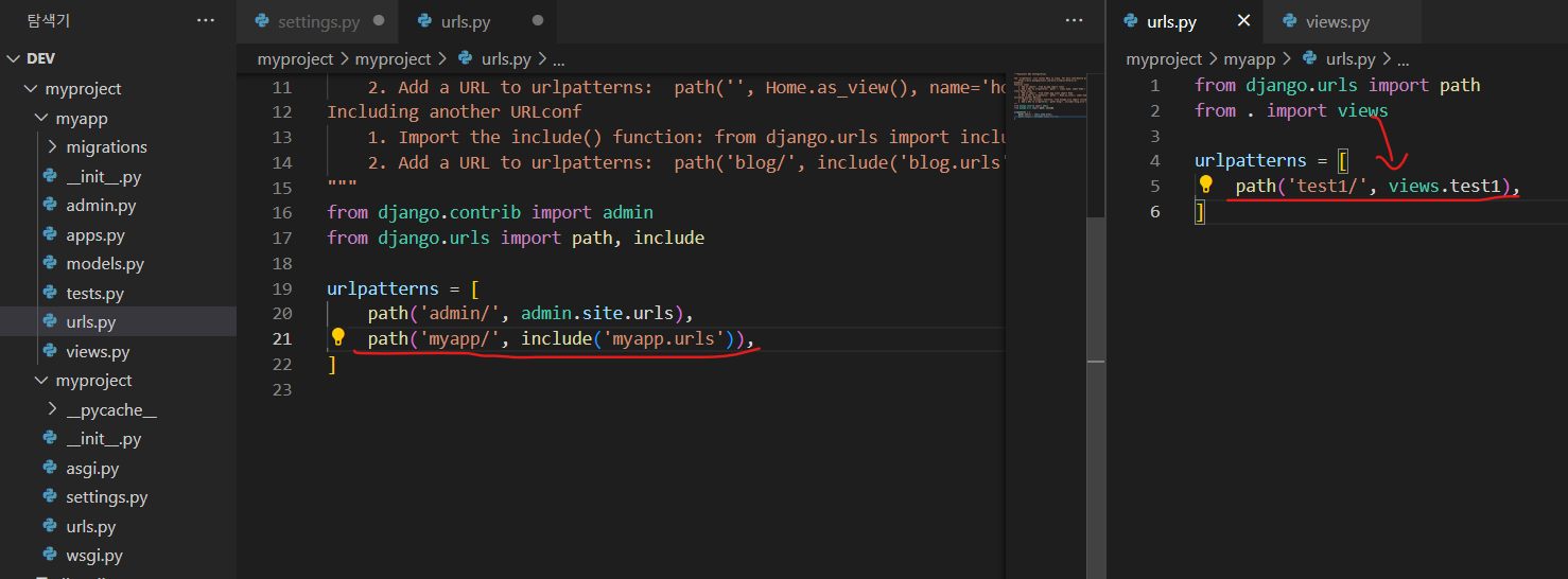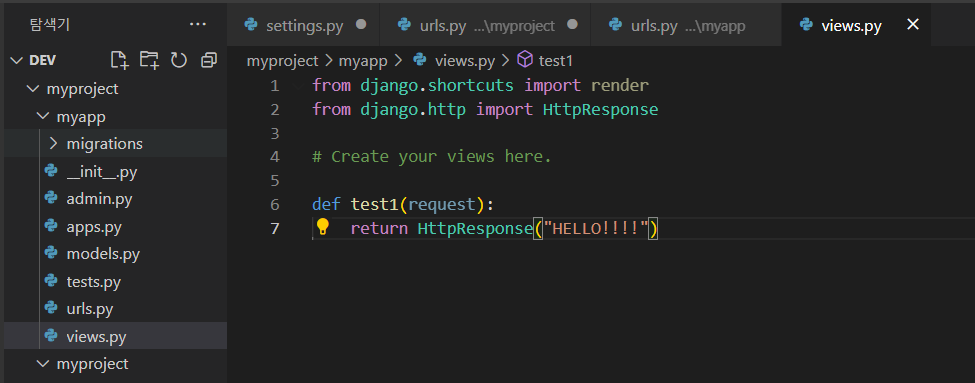 myapp 서비스로 안내를 해주기 위한 urls.py파일을 myapp폴더에도 만들어주고 이 파일을 프로젝트의 urls.py파일에서 맵핑시켜주었다. ~:8000/myapp/test1 주소로 요청을 보낼 경우 HELLO!!!!를 출력하도록 해보자