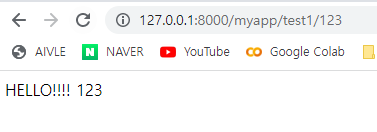 http://127.0.0.1:8000/myapp/test1/123로 접근한 결과는 다음과 같다. 123이 같이 출력된다.