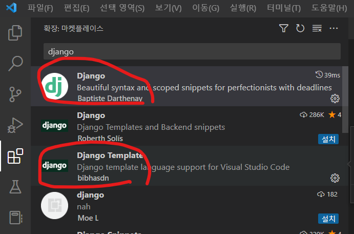- vscode 환경에서 개발하기 위해 파이썬과 장고 익스텐션을 설치해준다.