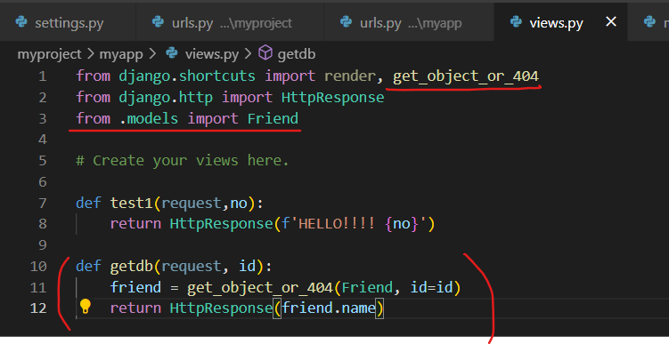 models.py모듈의 Friend 객체를 임포트 해주고, 인자로 받은 id값에 맞는 레코드의 name값을 반환해준다.