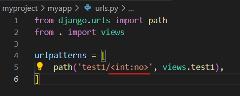 - path('test1/', views.test1) : ~:8000/myapp/test1 의 주소로 요청이 오면 같은 폴더의 views.py 모듈의 test1 메서드 호출 (URL에 따라 실행해 줄 View 메서드를 지정)