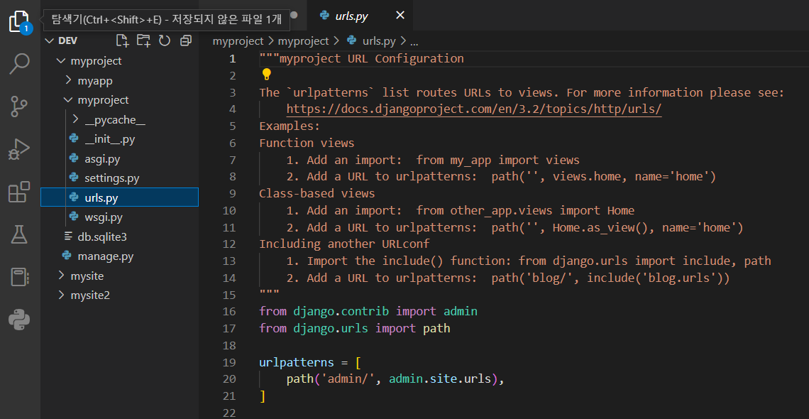 myproject/urls.py 파일을 보면 urlpatterns변수에 리스트 형식으로 요청 주소에 따른 맵핑이 되어 있다.