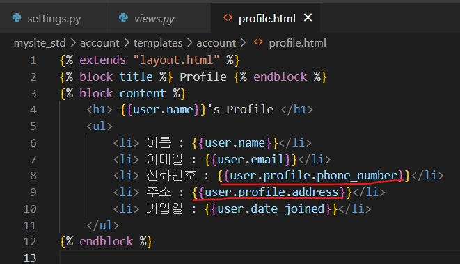 profile.html에서는 전달받은 user.profile.phone_number와 user.profile.address를 통해 바로 profile의 필드값을 받아올 수 있다.