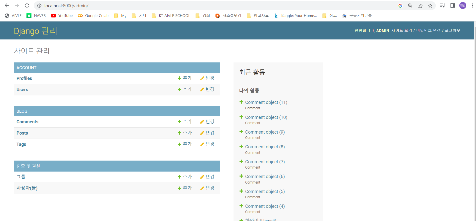 Model객체를 통해 테이블을 생성하게 되면 DB에 반영되는 것 뿐만 아니라 HTML의 <form>태그를 기반으로도 필드가 맵핑되어 내용이 생성된다. 이렇게 생성된 내용을 바로 장고의 기본 app인 admin을 통해 웹상에서 시각화 확인이 가능한 것이다.