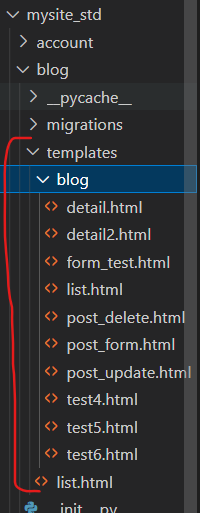 - 1번 경로는 오른쪽 사진과 같이 각 app의 app이름/templates/ 이하의 경로를 의미한다. 원래는 templates/ 아래에 바로 html 템플릿들이 존재하지만, 차례대로 경로를 탐색하는 템플릿 엔진의 특성 상 html 템플릿의 이름이 겹치면 다른 app의 템플릿을 탐색하지 못할 수 있기 때문에 app이름으로 된 디렉토리를 하나 만들어주고, 그 안에 html파일을 넣어서 중복을 막아주는 것이 좋다.