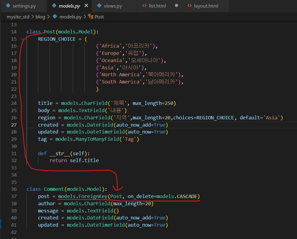 on_delete에는 참조하는 인스턴스가 삭제되었을 때의 처리 방식을 지정하는데, CASCASE, PROTECT, RESTRICT, SET_NULL 등을 지정해줄 수 있다.