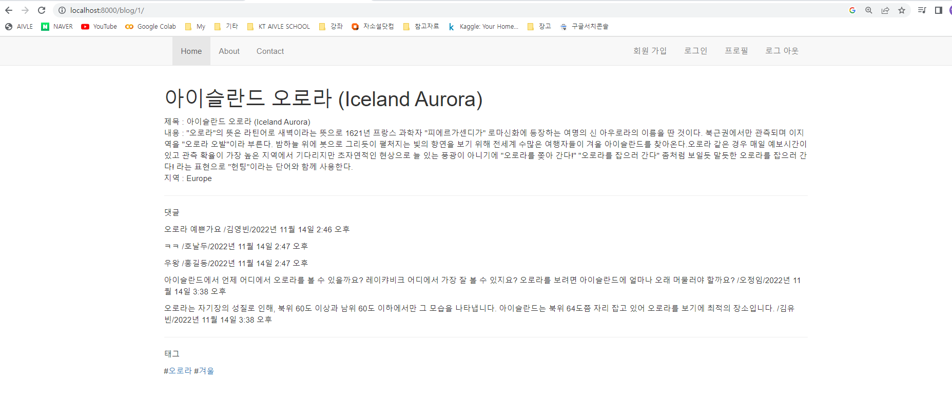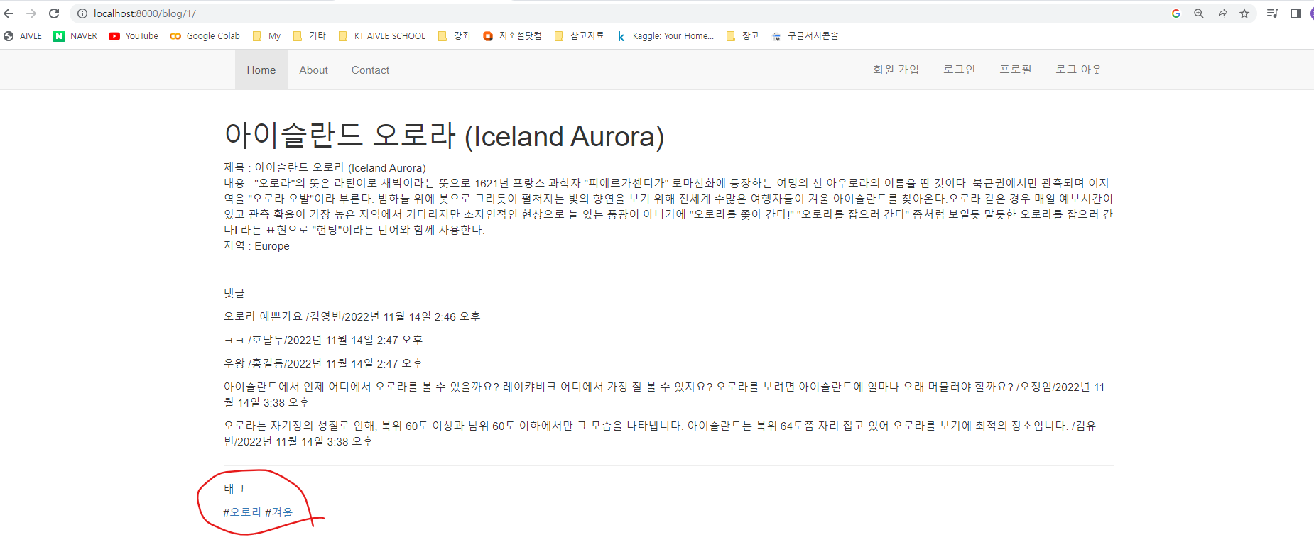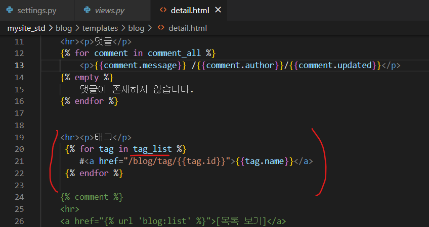 detail.html 템플릿에서는 받아온 tag_list를 for문을 통해 하나씩 화면에 나타낸다.
