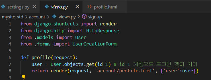 account app의 View에서 profile.html 템플릿을 반환해주면서 id=1인 User 모델의 인스턴스인 user를 context로 넘겨준다.