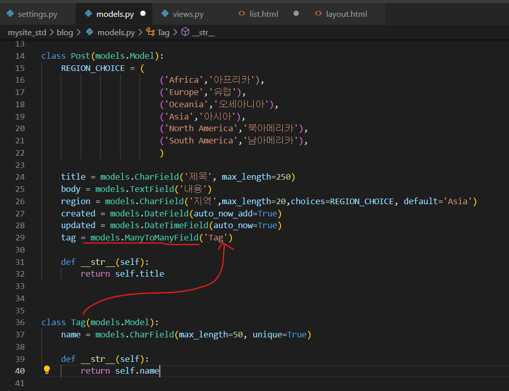 blog라는 app의 Post(게시글) 모델과, Tag(해시태그) 모델이 있다.