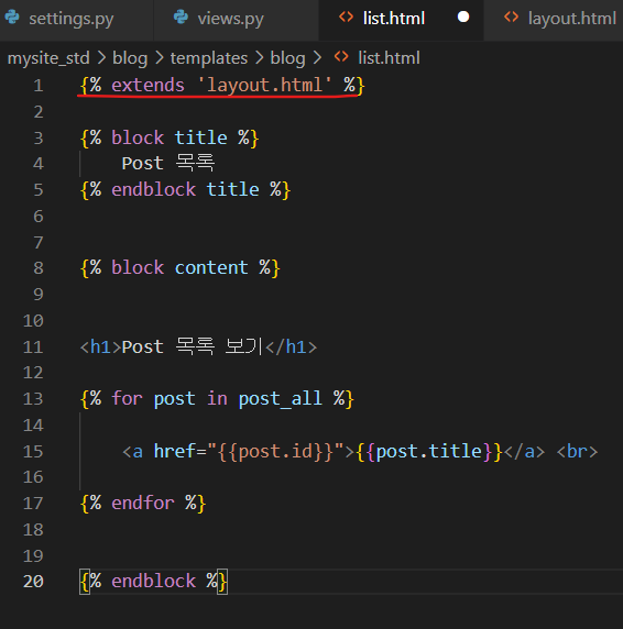 그리고 layout.html을 상속받는 자식템플릿인 list.html에서는 {% extends 'layout.html' %}으로 layout.html을 상속받는다.