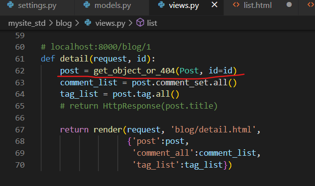 blog app의 View에서 detail메서드 호출 시에 post모델의 인스턴스를 받아오고, tag모델을 받아주었다.