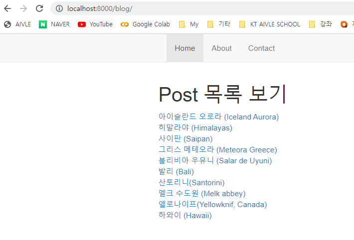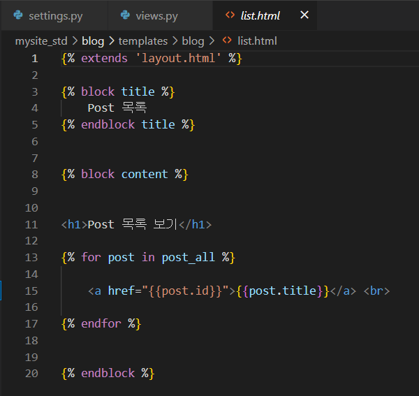 전달해준 context데이터의 post_all을 받아서 {% for post in post_all %} 로 for문을 통해 하나씩 화면에 렌더링 해준다.