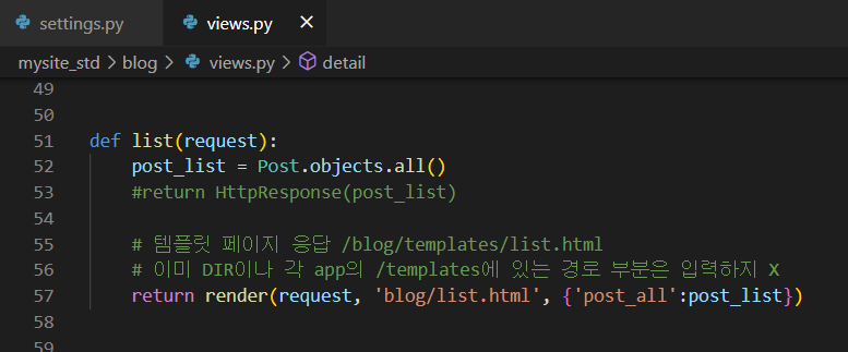 - render(요청, 템플릿경로, context)