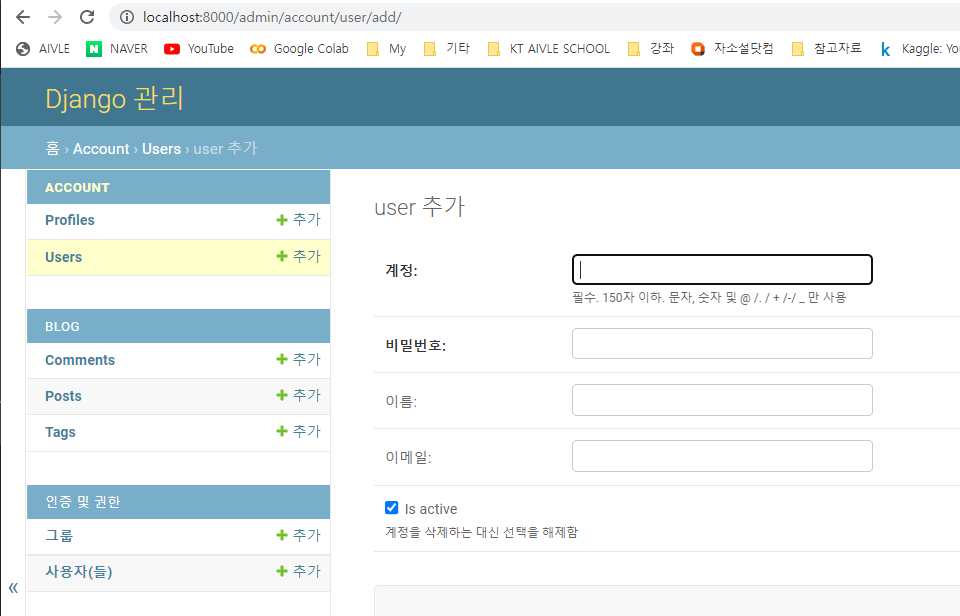 admin 페이지에서 위의 User모델에 값을 추가하려고 하면 옵션의 내용이 반영된 채로 나오는 것을 볼 수 있다.